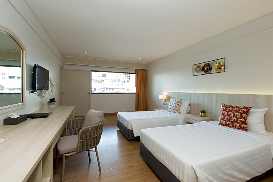 Grand Deluxe Pool view is 344 square feet and includes 2 double beds 131-150 width plus balcony, extra beds on demand, cable tv, and hairdryer and is Wheelchair-accessible.